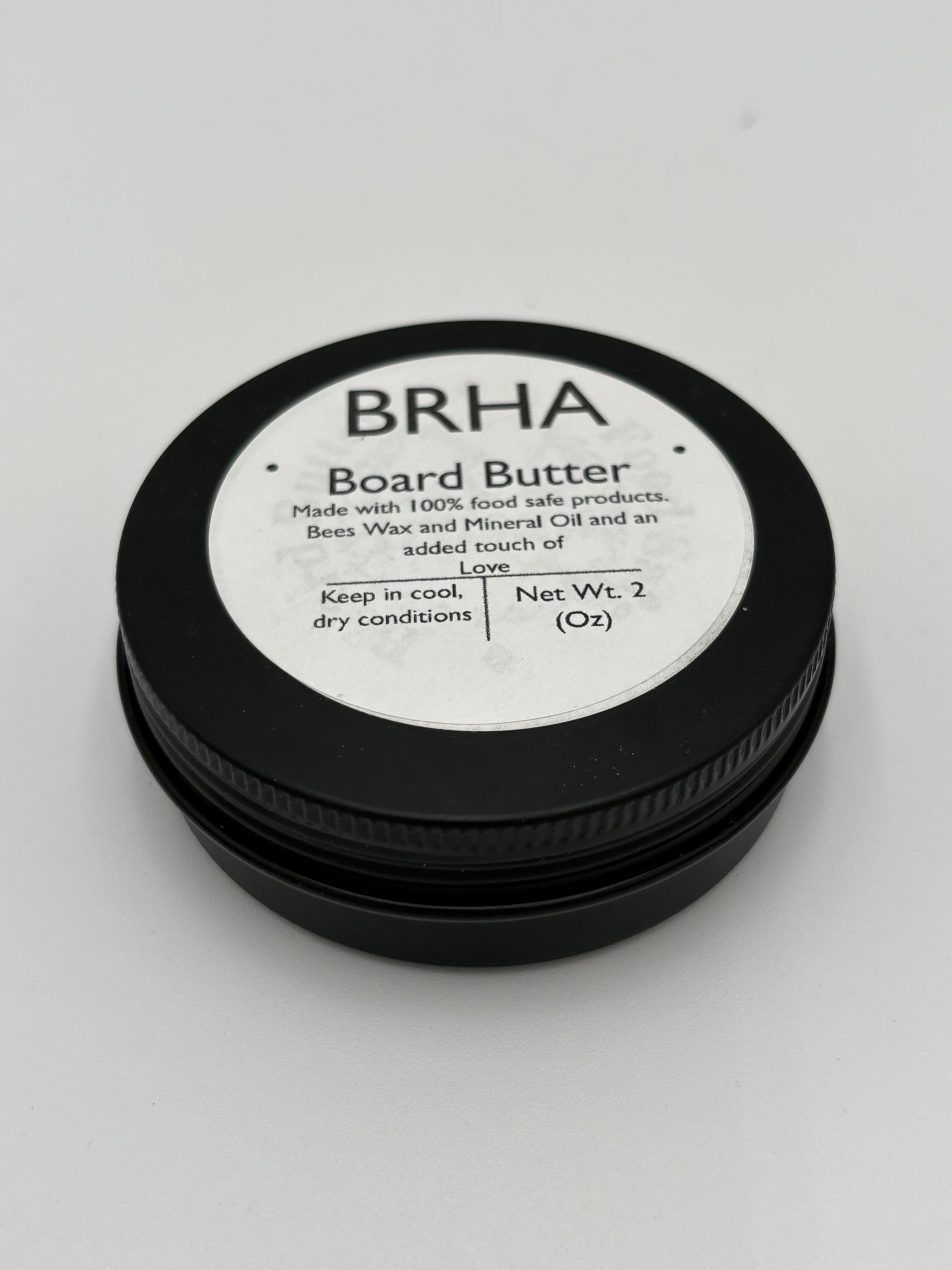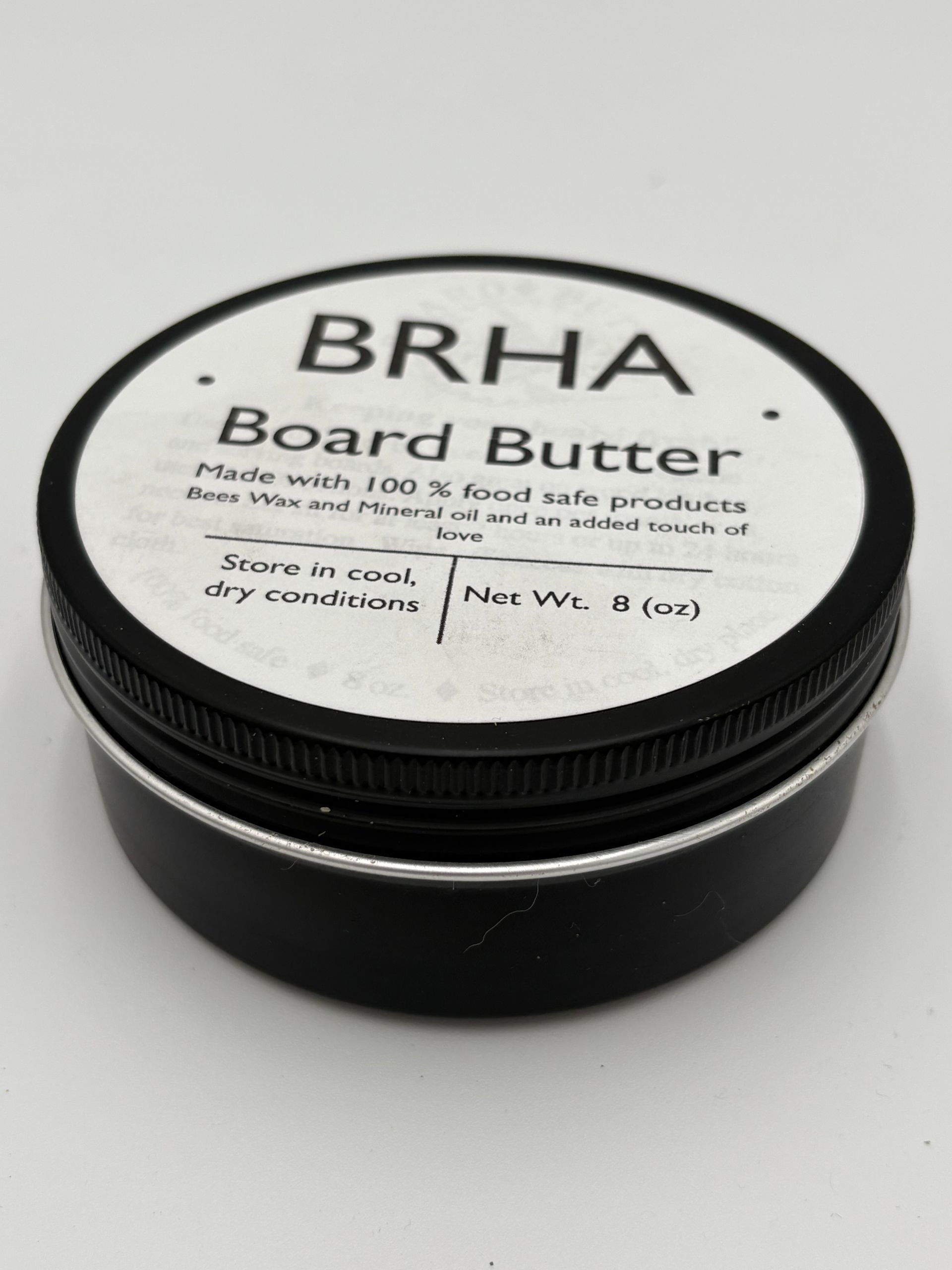 Our BRHA Board Butter is made in house from a blend of mineral oil and white beeswax and is 100% food safe.